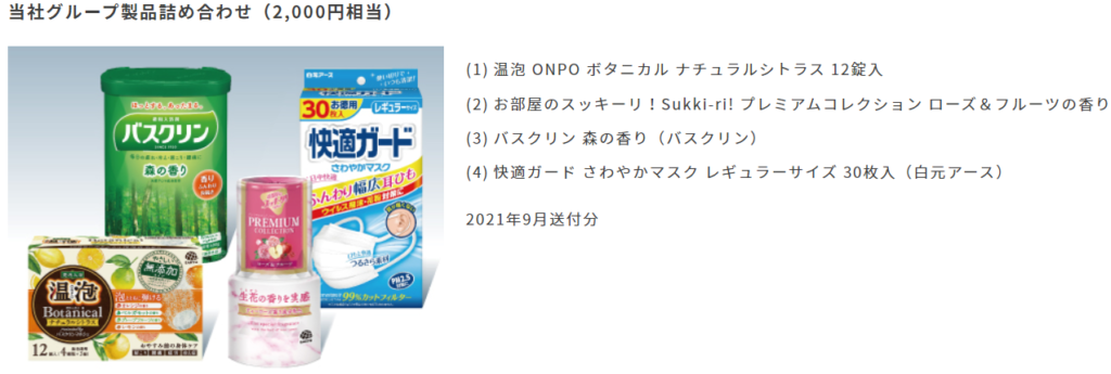 アース製薬は株主優待として『2000円相当の自社製品』を採用しています。 『↓』はアース製薬の株主優待案内ページです。ぜひ参考にされてください^^