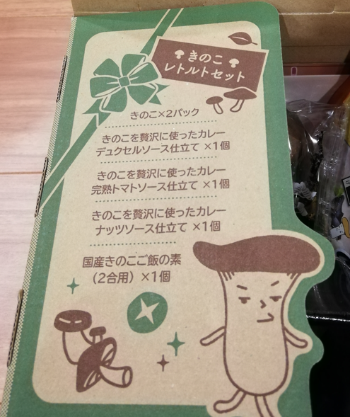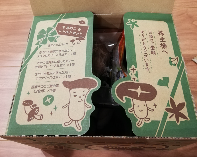 株主優待の中身は、キノコ以外にキノコレトルトカレーも入っています。