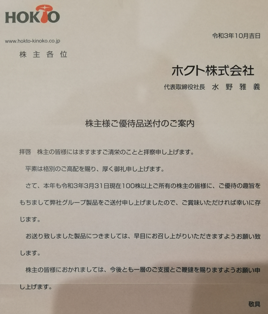 2021年10月某日、『㈱ホクト(証券コード:1379)』 から株主優待が届きました☆彡なんと、 キノコ等自社製品セット!!