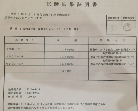 あいさつ文と一緒に、お米の検査結果も入っていました。福島県に近いからでしょうか、セシウム等の放射性物質の分析結果が記載されています。品質に問題ないことが確認でき、消費側からすると大変すばらしく感じます。