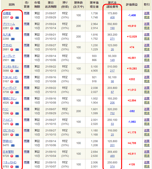 9月は全15銘柄についてクロス取引しました。『↓』に銘柄と手数料(諸経費等)を載せています^^