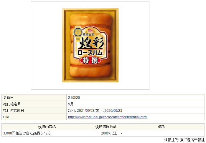 200株保有で3000円分の丸大ハムが貰えます。☆彡