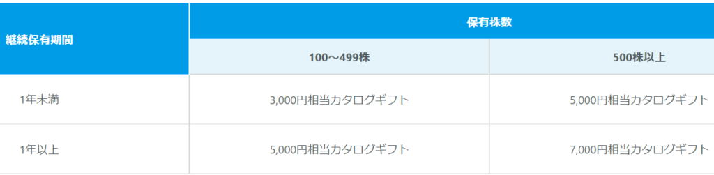 なお、1年以上株を保有された場合は、5000円相当のカタログギフトとなります。