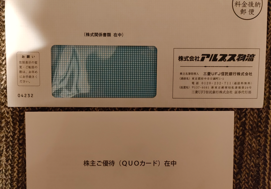 アルプス物流/株主優待/2022年 手数料100円台で優待ゲット!1000円クオカード到着。