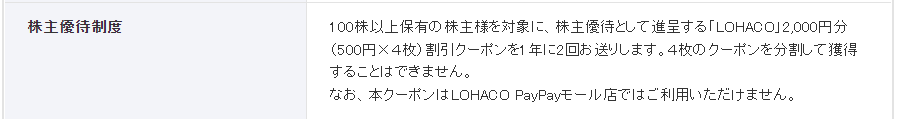 アスクルの株主優待は5月と11月にそれぞれ100株保有していれば、各月でこの『2000円相当のLOHACO割引クーポン』が貰えます。