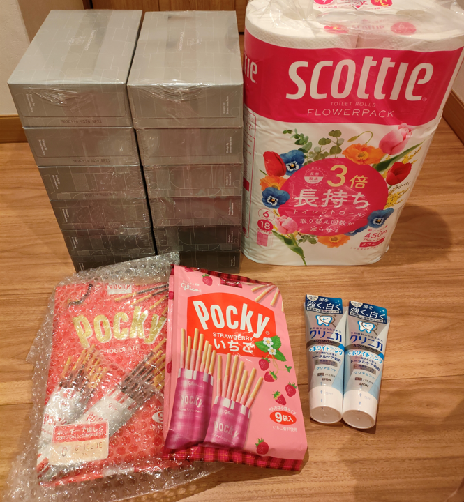 2000円は割引クーポンで引かれますので、600円で、ティッシュ、トイレットペーパー、歯磨き粉、お菓子をゲットしました。