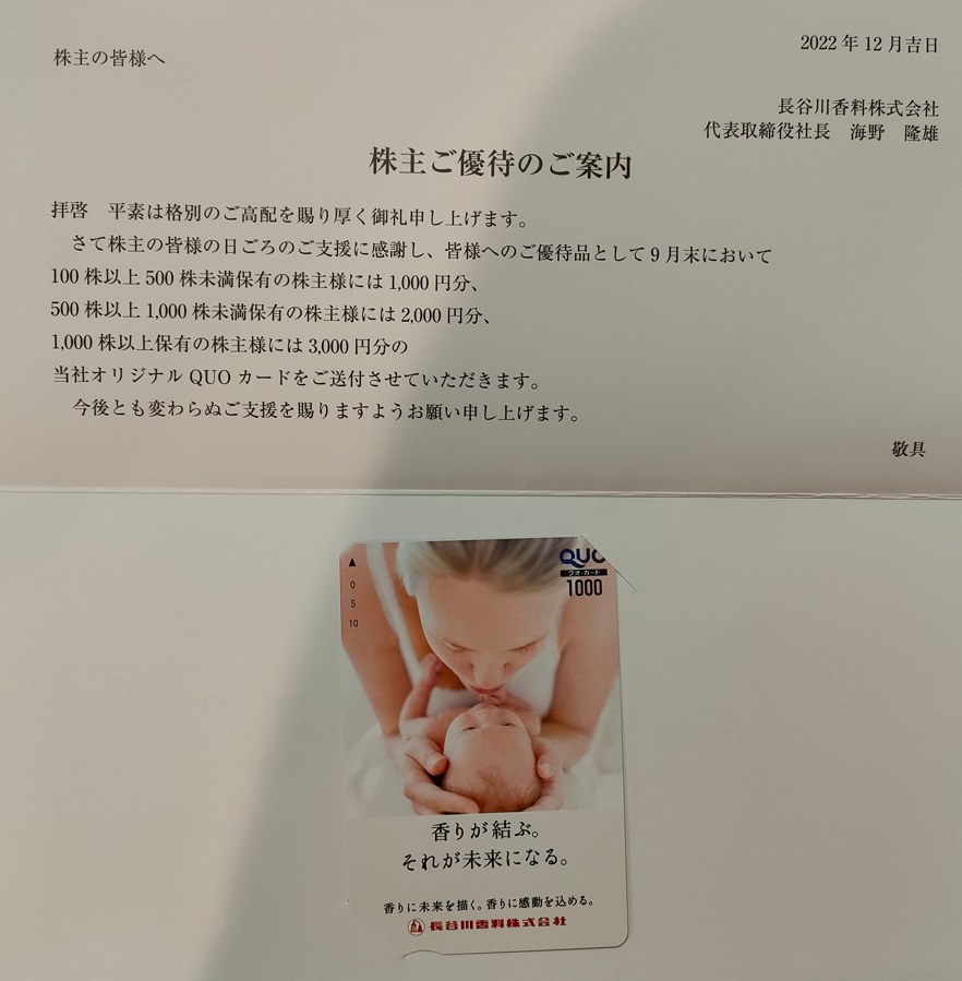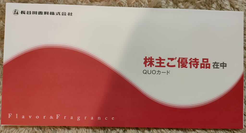 株主優待で年間数十万円も得している私が、『長谷川香料』の株主優待、『1000円クオカード』を実物の写真を交えてご紹介します。