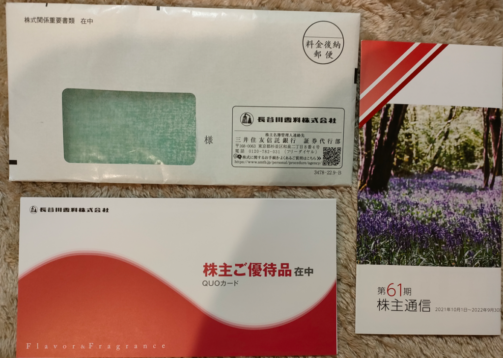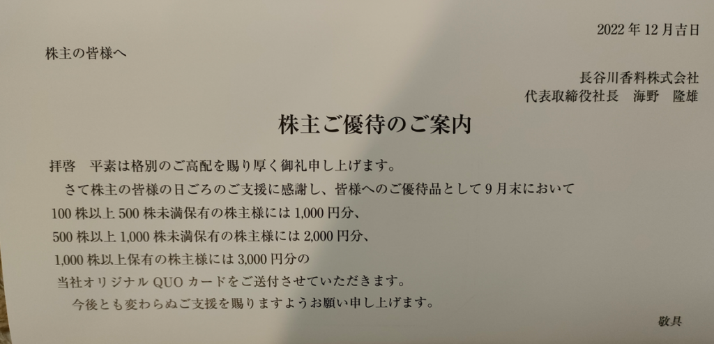 2022年12月某日、『長谷川香料(証券コード:4958)』 から株主優待が届きました。