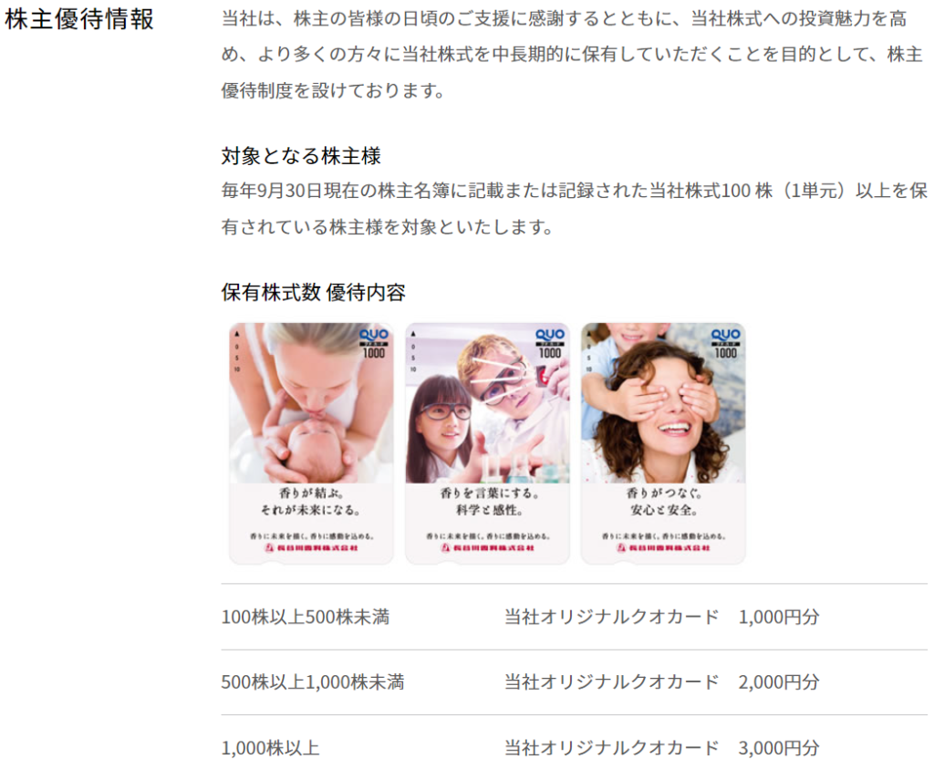 『長谷川香料』の株主優待は、9月に100株保有していれば、『1000円クオカード』が貰えます。優待品を得るための長期株保有条件もないのでおすすめです。