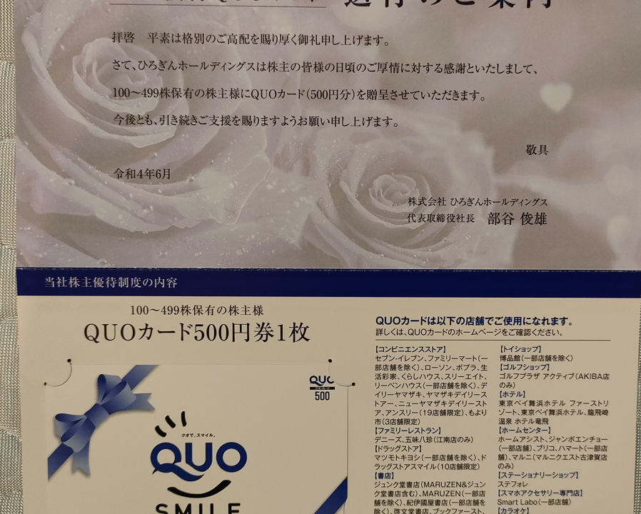 ひろぎんホールディングスの株主優待は『500円クオカード』