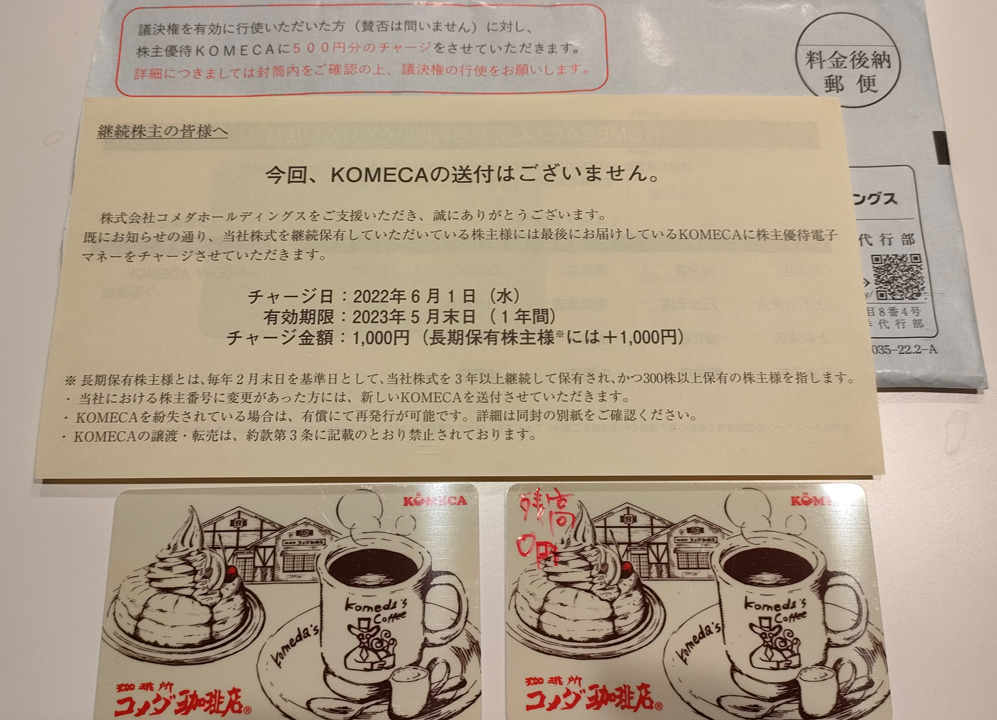 2022年5月某日、『コメダホールディングス(証券コード:3543)』 から株主優待が届きました。