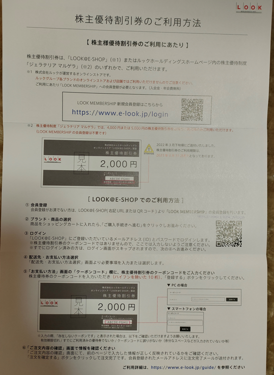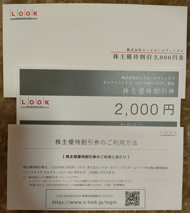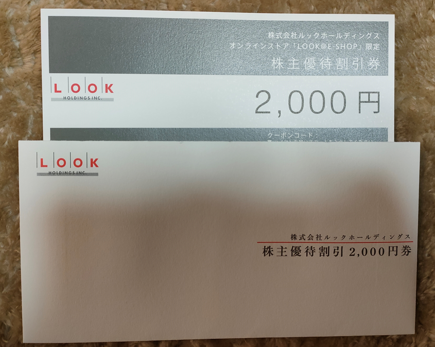 『↓』はルックホールディングスから優待クーポンが届いた様子です。2000円分が届きました。