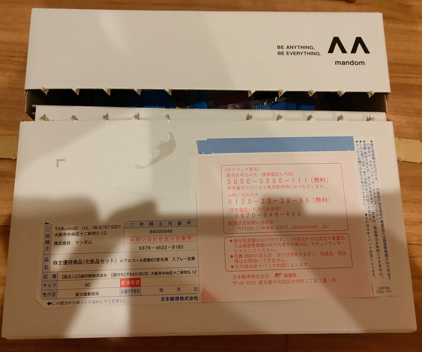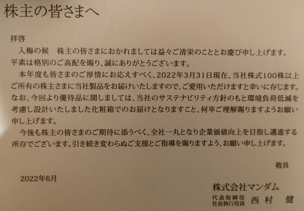 2022年7月某日、『マンダム(証券コード:4917)』 から株主優待が届きました。