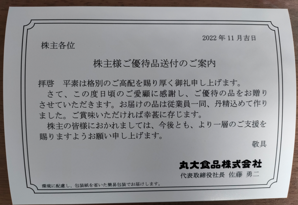 2022年11月某日、『丸大食品(証券コード:2288)』 から株主優待が届きました。