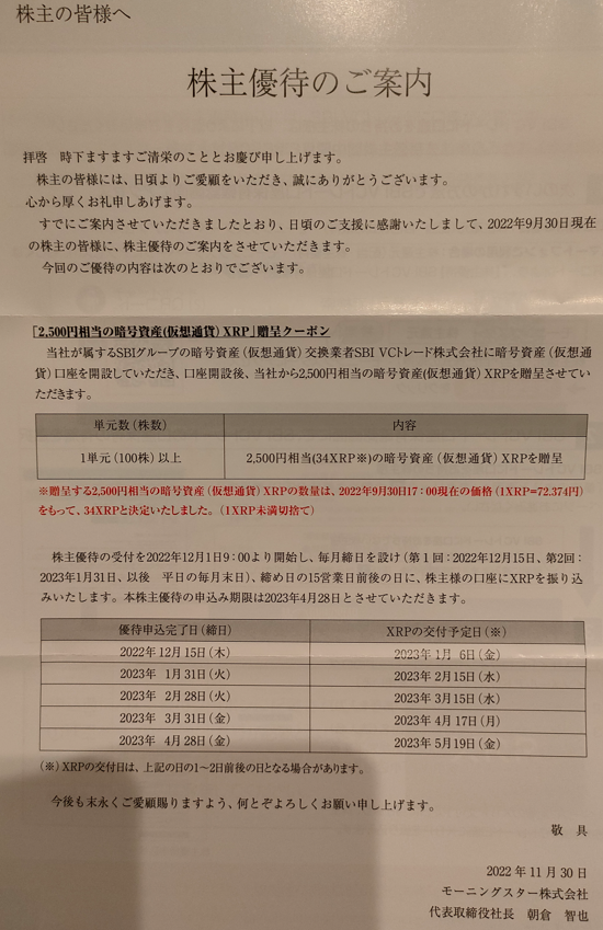 モーニングスターの株主優待は『仮想通貨リップルと株式新聞』