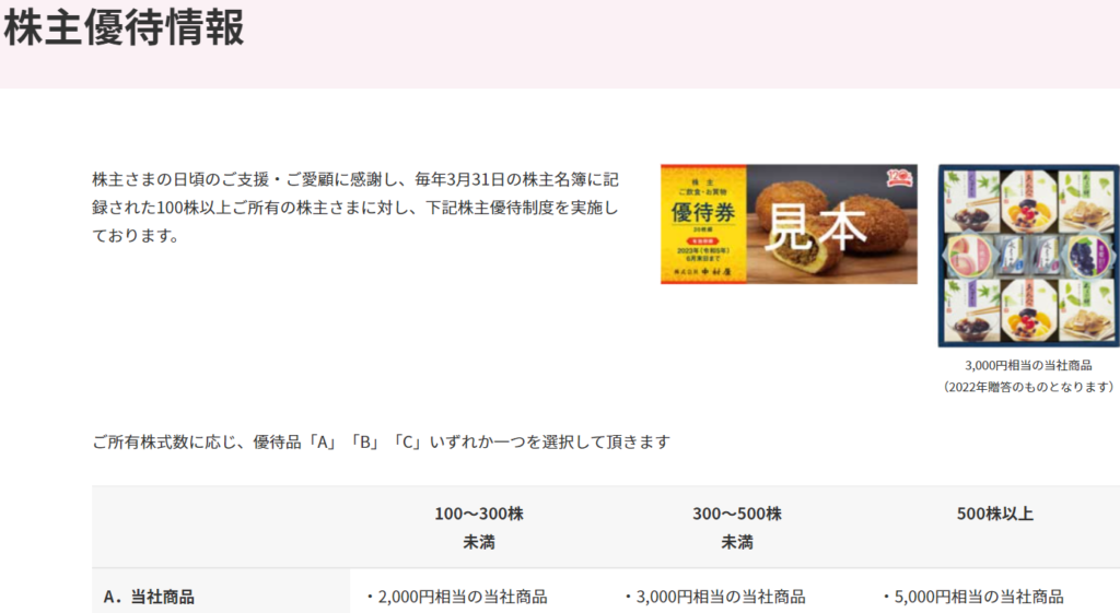 『中村屋』の株主優待は、3月に100株保有していれば『2000円相当自社製品詰め合わせ』が貰えます。