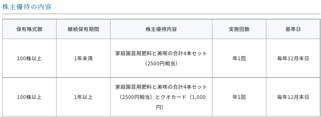 『OATアグリオ』の株主優待は、12月に100株保有していれば『自社製品セット』が貰えます。