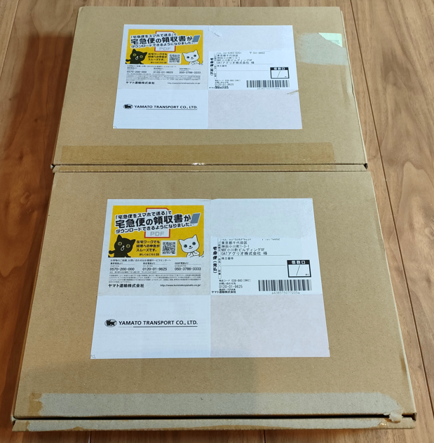 『↓』は宅急便から荷物が届いた様子です。外装の箱で中の商品がしっかりと守られていました。