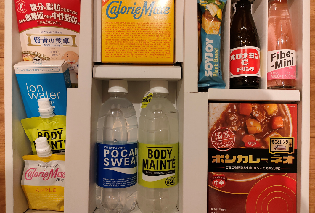 届いた商品の一覧です。カロリーメイトのバニラ味は新商品です。