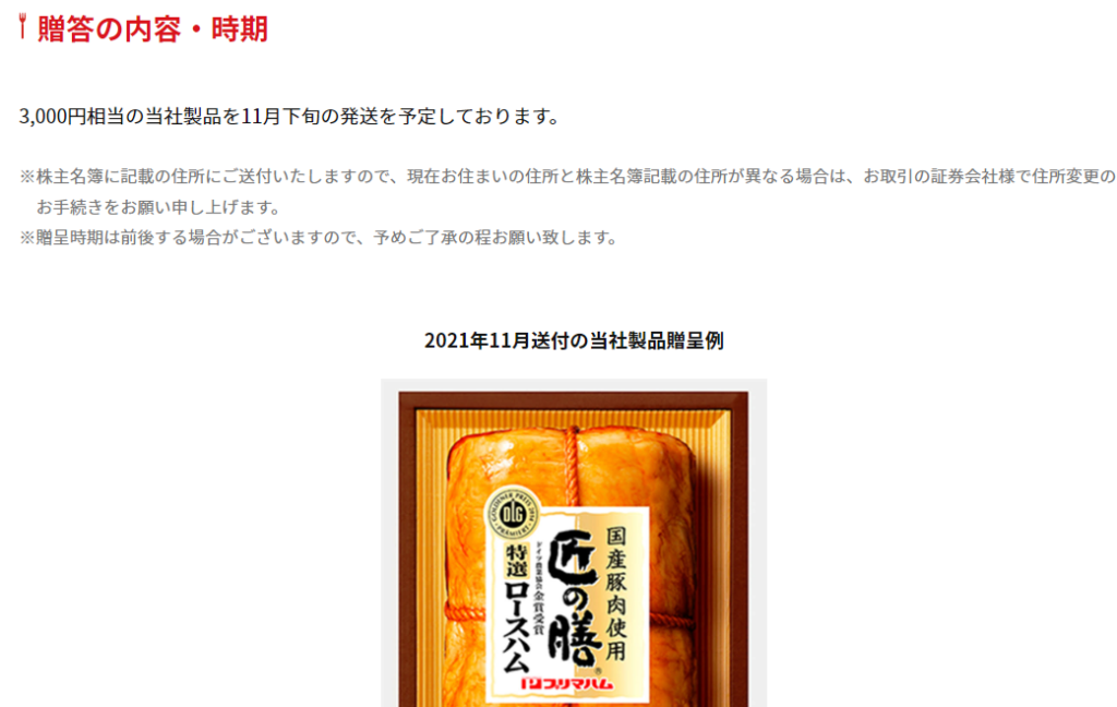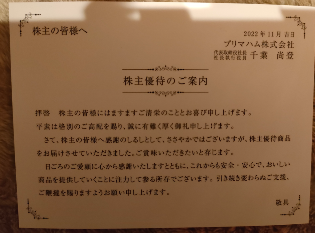 2022年11月某日、『プリマハム(証券コード:2281)』 から株主優待が届きました。