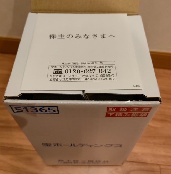 2022年7月某日、『宝ホールディングス(証券コード:2531)』 から株主優待が届きました。
