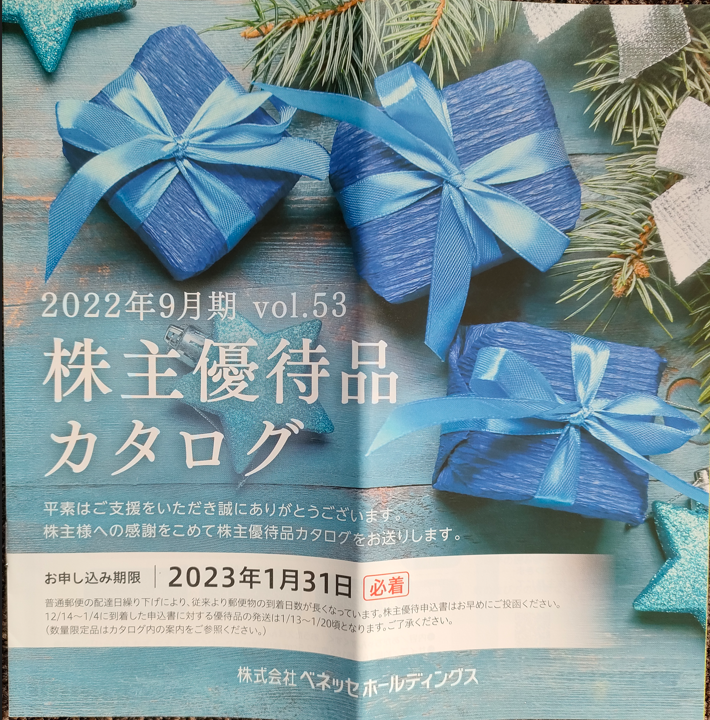 2022年12月某日、『㈱ベネッセホールディングス(証券コード:9783)』 から株主優待が届きました☆彡なんと、 自社グループ会社の優待カタログ!!