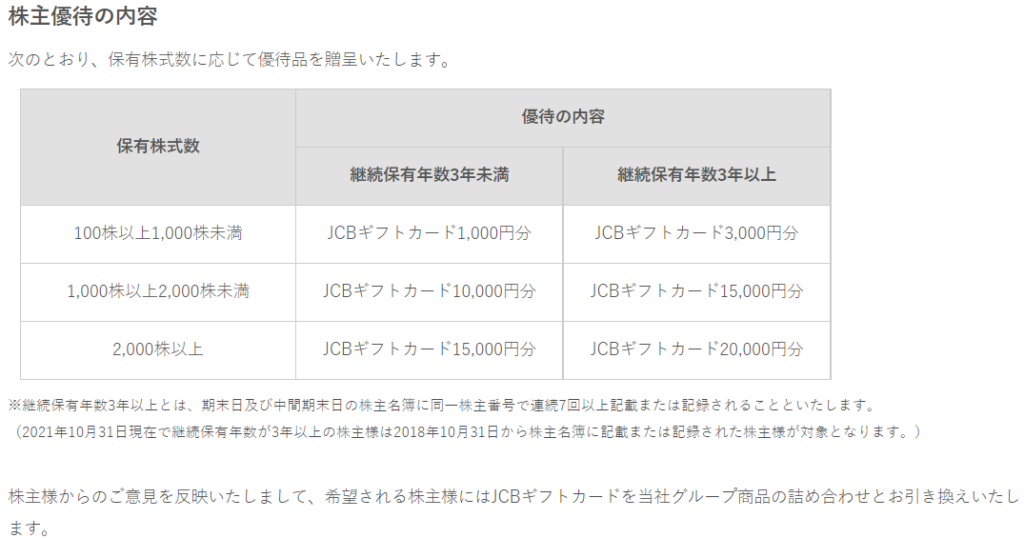 100株で1000円、1000株で10000円、2000株で15000円のギフトカードが貰えます。