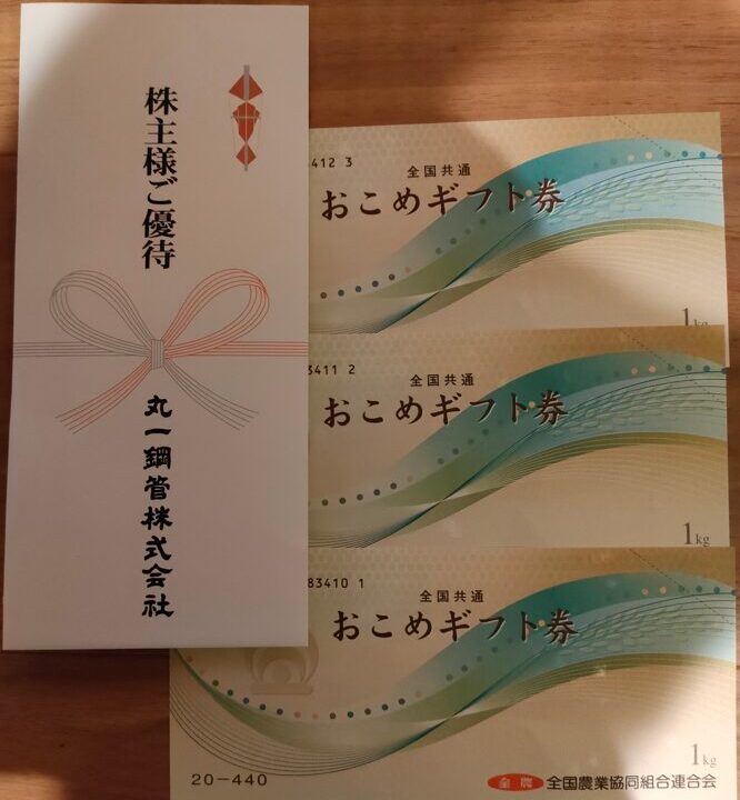 『丸一鋼管』の株主優待は、3月と9月に100株保有していれば、『1320円分のお米券』が貰えます。優待品を得るための長期株保有条件もないのでおすすめです。