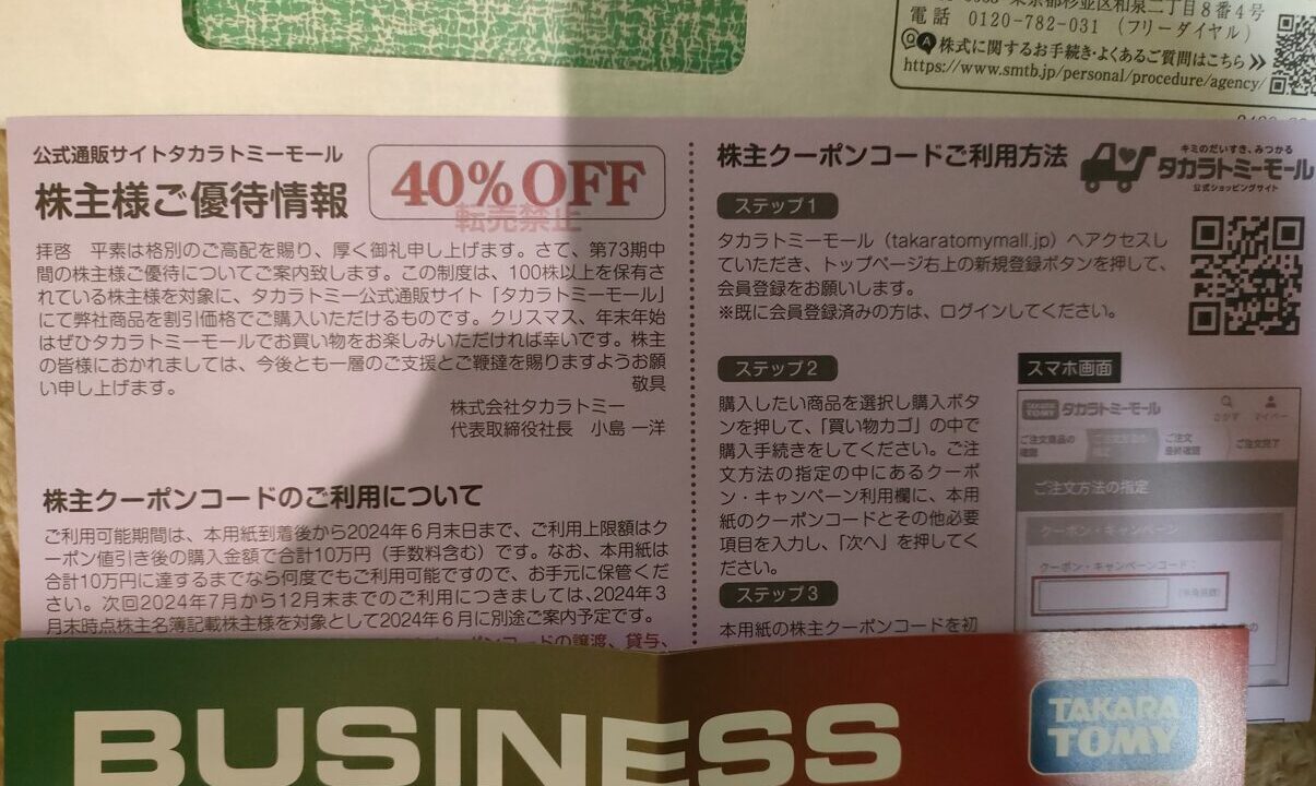 株主優待で年間数十万円も得している私が、『タカラトミー』の株主優待、『40%OFFクーポン券』を実物の写真を交えてご紹介します。