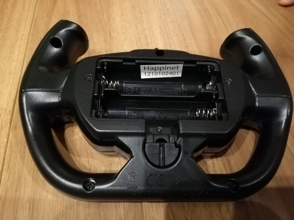 ↓は、ラジコン本体とコントローラーの裏面の写真です。本体側には単三電池3本。コントロール側には単三電池2本が必要です。使い切りの単三電池では、遊ぶたびに電池交換が必要となりますので、充電池を6本準備することをおすすめします。