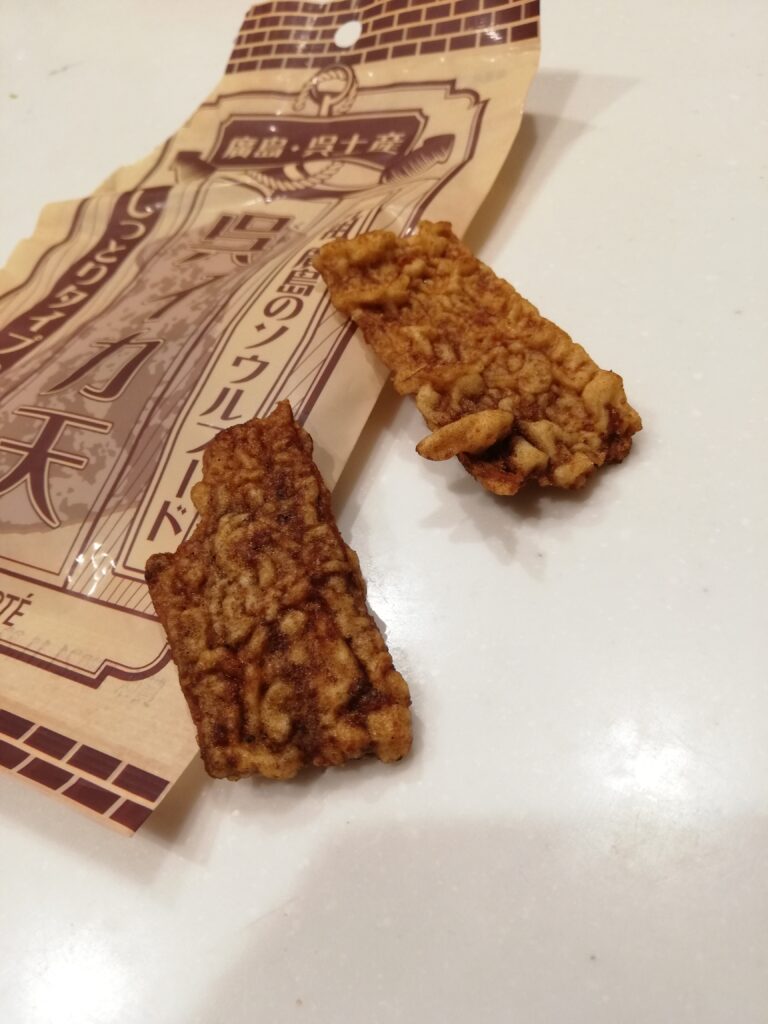 『↓』はしっとりタイプの醤油味。イカフライというより、もう濡れせんべいでした!!