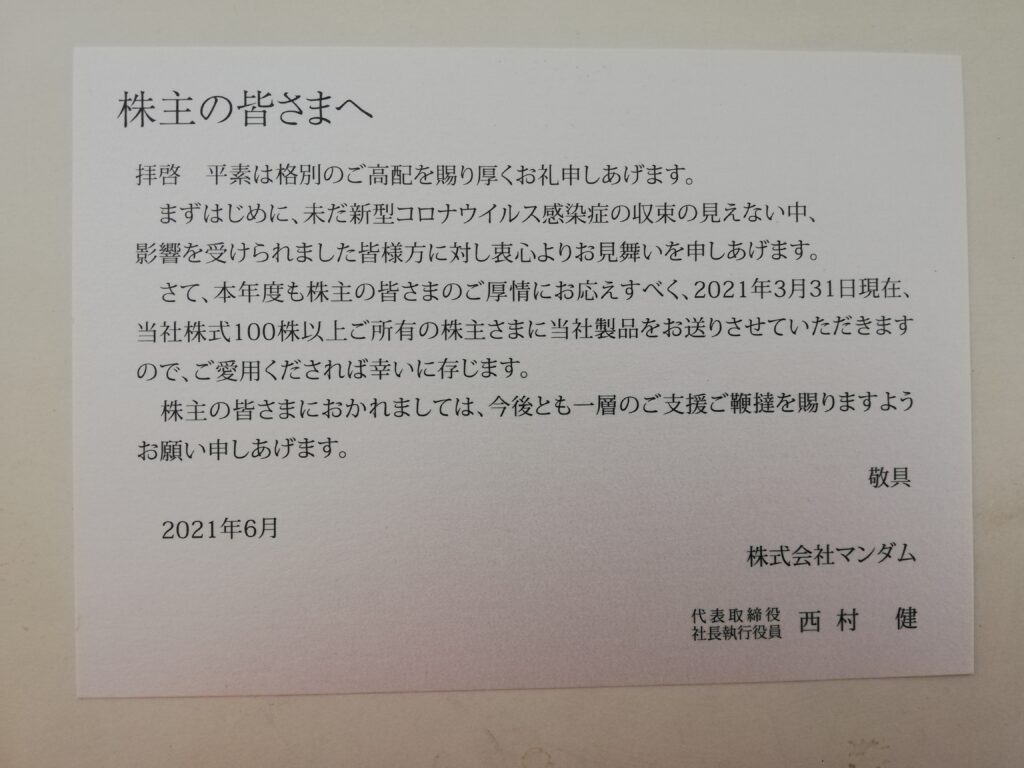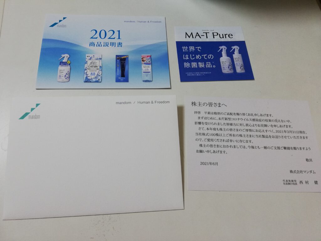 2021年6月某日㈱マンダム(証券コード4917)から「株主優待」が届きました☆彡なんと5000円分の自社製品(化粧品等)×2個!!今回は頂いた紹介すべて紹介します!!いいなっと感じたら次回ぜひクロス取引してみてくださいね☆彡