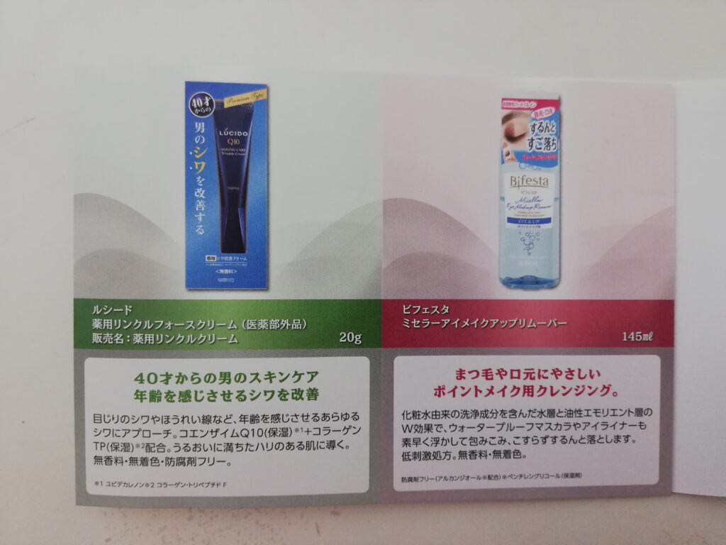 マンダムの株を100株×2 保有していたため、4商品×2個の計8個の株主優待品を頂きました^^10000円相当です。4商品名は以下の通りでした。1つずつ紹介します^^