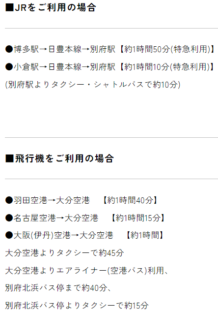 別府を訪れる際、交通アクセスの確認が重要です。杉乃井ホテルまでは、別府駅からバスやタクシーが便利です。特に宿泊者には無料シャトルバスも提供されており、移動が楽ちん。駅近くには観光名所が集中しているため、そこからも簡単にアクアビートに行けます。しっかりとプランを立てて、ストレスフリーな海の旅を楽しみましょう。↓は杉乃井ホテル公式HPより抜粋。