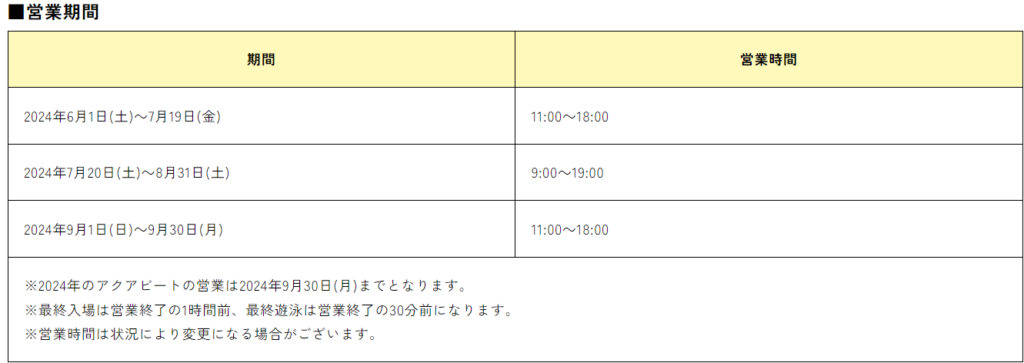 2024年のアクアビートの営業期間は、夏季の7月から9月までです。営業時間は、午前10時から午後5時までの他、ナイトプール開催日の場合は午後9時まで延長されます。詳しい営業日やイベントについては、公式サイトでチェックしてください。素晴らしいプール体験をお楽しみください!