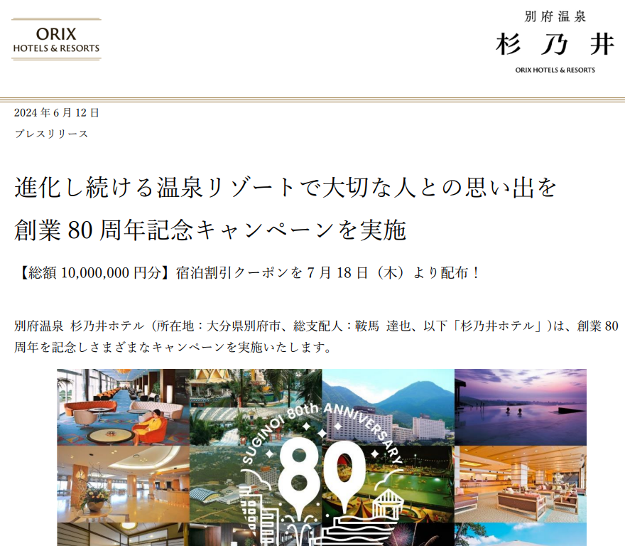 ↓は杉乃井ホテル80周年クーポン配付のお知らせです。すでに予算上限に達している可能性ありますがチェックしてみるといいでしょう。