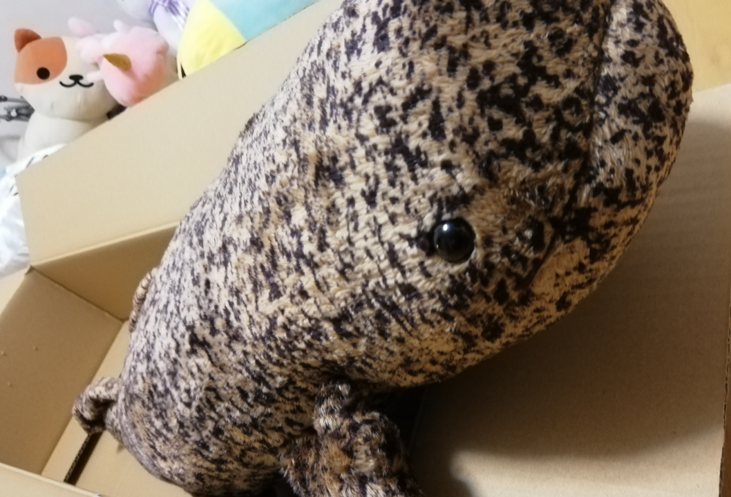 長段ボール箱を早速開封してみました。すると中から、『オオサンショウウオ』が!!段ボールと同じ大きさのぬいぐるみです。1m弱程度あります。