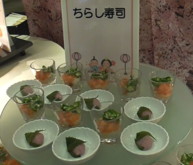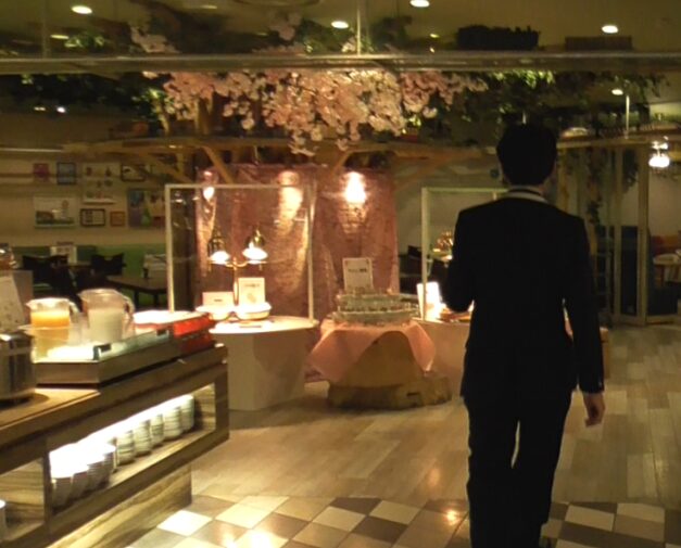子連れの家族には、ビュッフェ会場入って右手のキッズエリアが大人気です。この時は3月でしたので、桜がお出迎え🌸