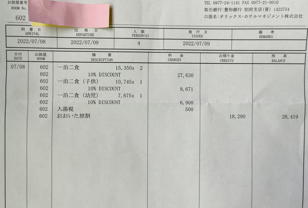 杉乃井ホテル本館に宿泊した時の領収書(2022年7月)