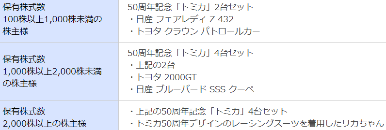 ビジネスレポートによると、100株保有で『トミカ2台セット』、1000株保有で『トミカ4台セット』、2000株保有でやっと『オリジナル リカちゃん人形』がもらえます。