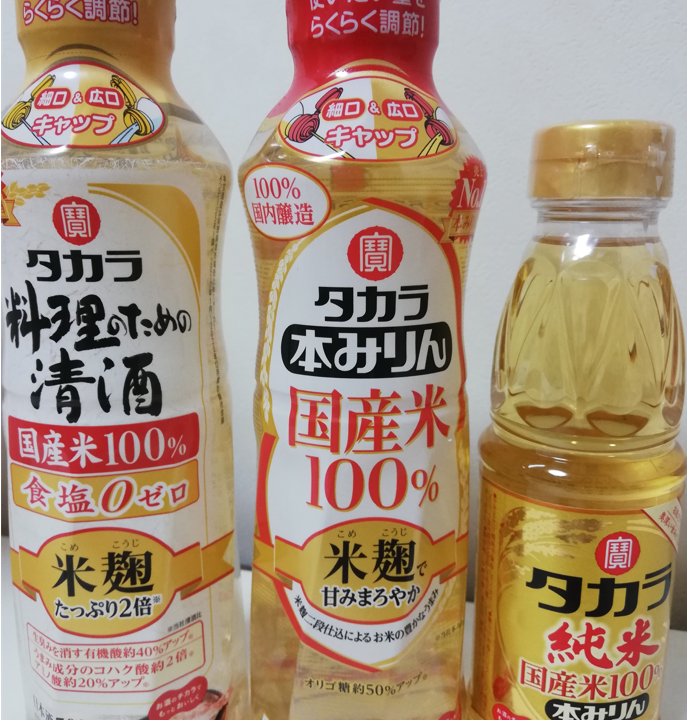 『↓』はパッケージの中身の写真です。3種類の『調味料』がお目見え。『純米 タカラ本みりん』、、、いつも普通の本みりんしか使ったことがないので、どんな味の料理に仕上がるか、楽しみです☆彡
