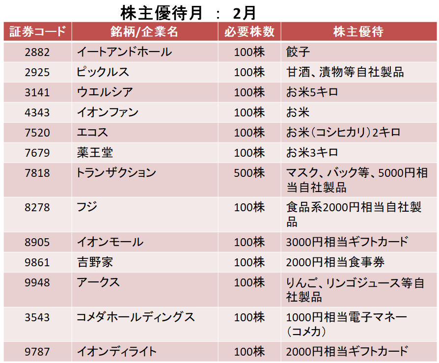 それでは、2月から12月までの各銘柄の株主優待品一覧のご紹介です。