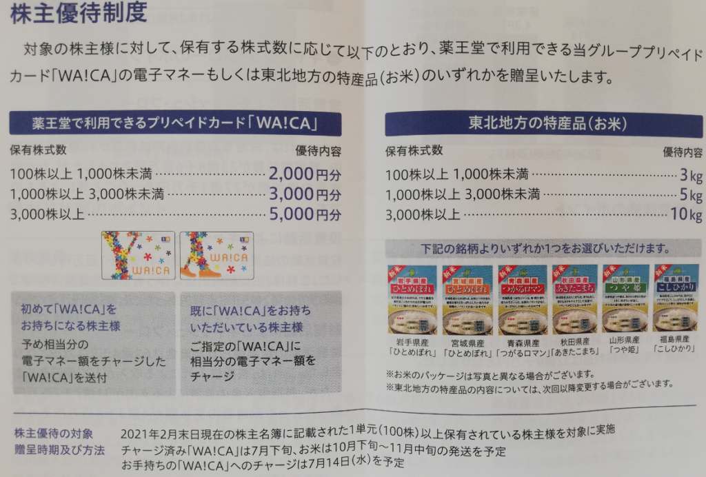 ㈱薬王堂の株主優待では、100株保有で以下の7種類の優待が選択できます。中でもおススメが東北地方の特産品(お米)です(^^♪