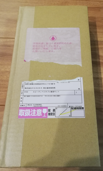 それでは、野菜栽培キットのご紹介です。『↓』は宅急便から荷物が届いた様子です。外装の包装で中の商品がしっかりと守られていました☆