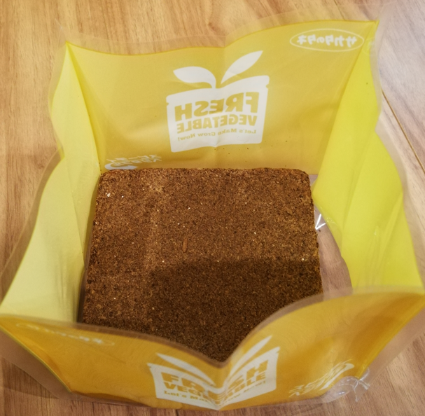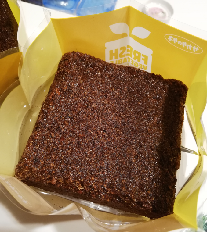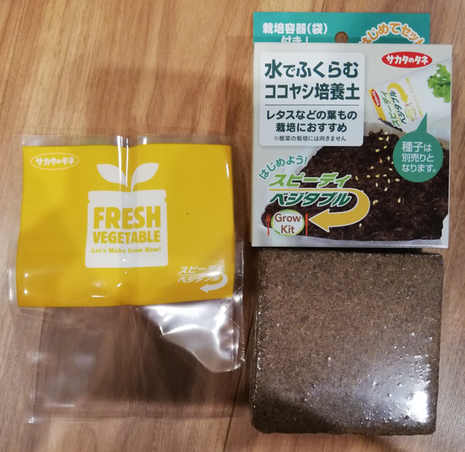 箱の中身は、ココヤシ培養土。付属の種で野菜を育てます。