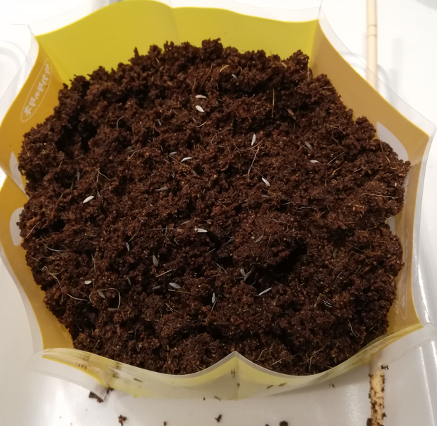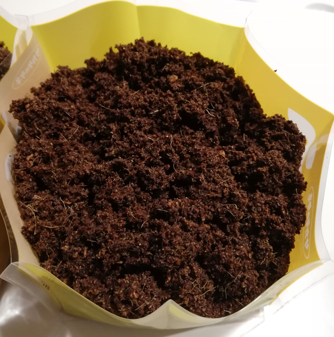 ココヤシ培養土を黄色の容器に入れます。