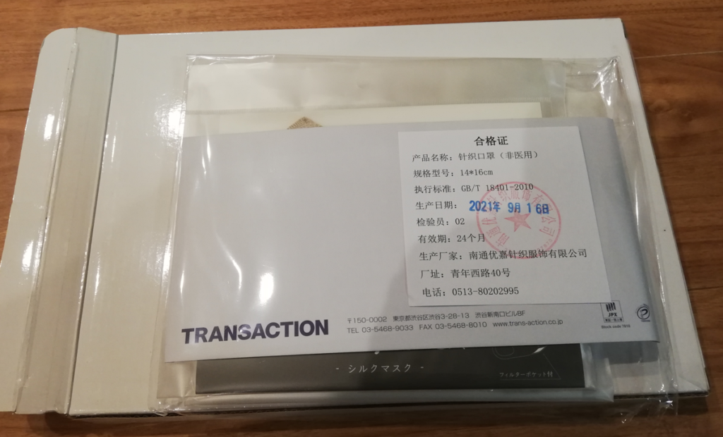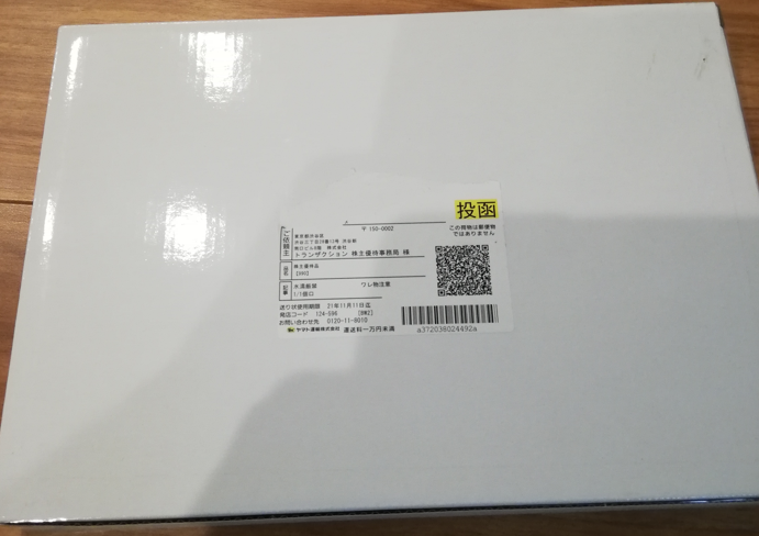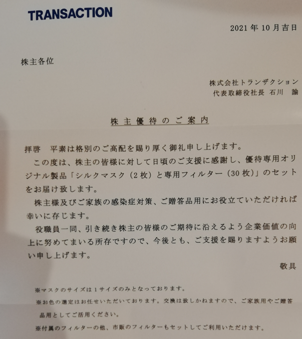2021年10月某日、『㈱トランザクション(証券コード:7818)』 から株主優待が届きました☆彡なんと、 5000円相当の自社製品(シルクマスク)!!