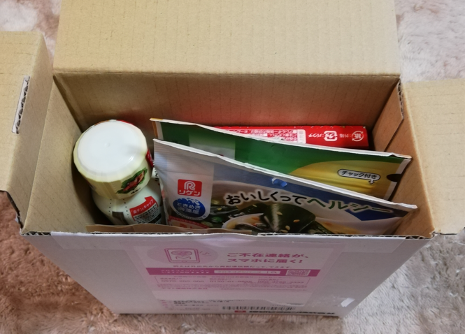 それでは、1000円相当自社製品(食品詰合わせ)のご紹介です。『↓』は宅急便から荷物が届いた様子です。外装の箱で中の商品がしっかりと守られていました☆