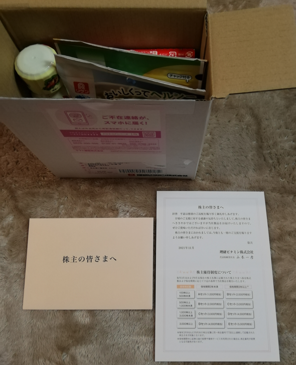 2021年12月某日、『㈱理研ビタミン(証券コード:4526)』 から株主優待が届きました☆彡なんと、 1000円相当の自社製品(食品詰合わせ)!!