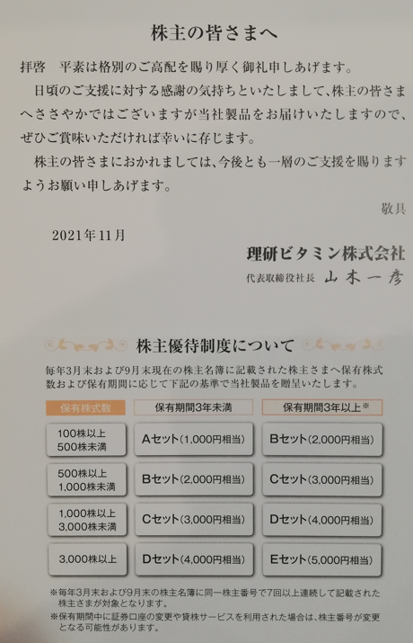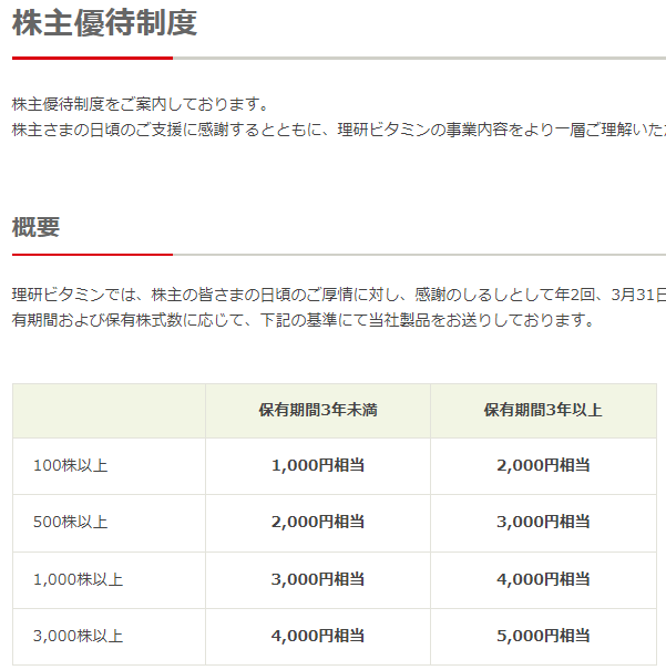 理研ビタミンの株主優待は9月と3月に100株保有していれば、それぞれの月で『1000円相当自社製品(食品詰合わせ)』が貰えます。